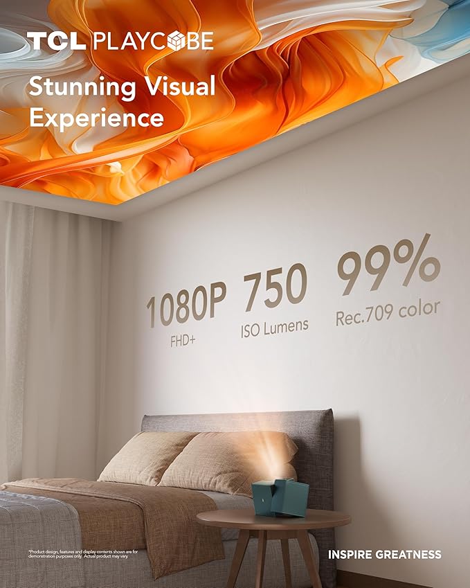 - TILT, TWIST, PLAY: Inspired by the Rubik's Cube, TCL PlayCube Projector delivers instant setup magic with no stands required. Simply twist up to 90° to find your perfect viewing angle - whether you're binge-watching in bed or hosting a movie night.