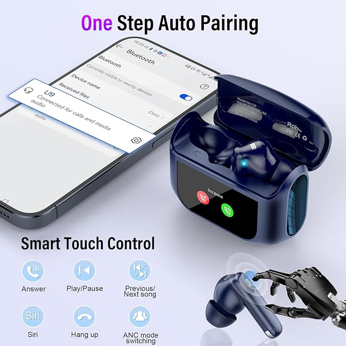 - Multifunctional smart touch screen: These touch screen earbuds come with a color touch display. You can use the ear buds or charging case to control music playback, switch tracks, answer and end calls, activate noise-canceling mode, and more. In addition, the touch screen also provides a series of functions such as volume adjustment, camera control, seven language switching, wallpaper switching, screen brightness adjustment, headphone search, timer, etc