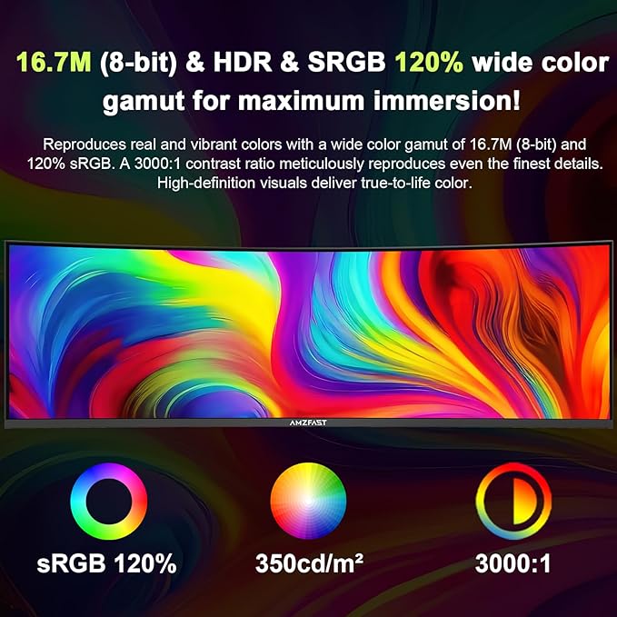 Amzfast 49 Inch Curved Monitor 120Hz DQHD 5120x1440p Ultrawide Gaming Monitor, 120% sRGB, 3000:1, 1ms, HDR, Adaptive Sync, PIP/PBP, Low Blue Light, HDMI 2.0/DP 1.4, VESA 75x75, AMZG49C7U