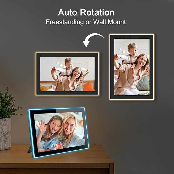 - 【NEON LIGHT】Akimart WiFi picture frame has neon light, you can manually choose your favorite light color effects to meet the needs of different color atmospheres. And according to your own needs, you can choose whether to turn off the lights, adjust the brightness of the lights, and enable automatic changes in the lights to create a unique scene atmosphere.