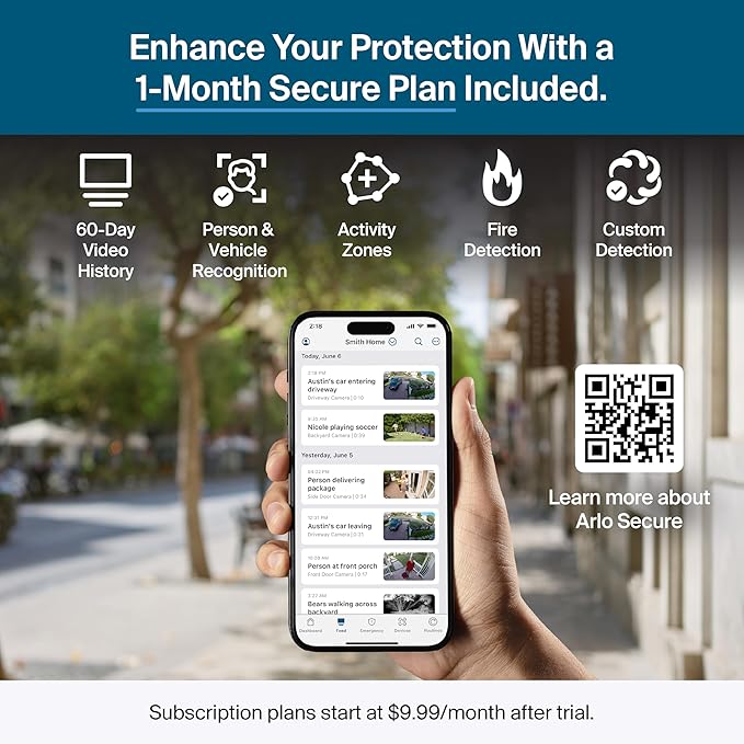 - Enhanced Protection with 1-Month Secure Plan Included: Access 60-Day Video History, Custom Detection, Event Captions, 24/7 Emergency Response, Activity Zones & more. After trial, subscription plans start at $7.99/month (billed annually).