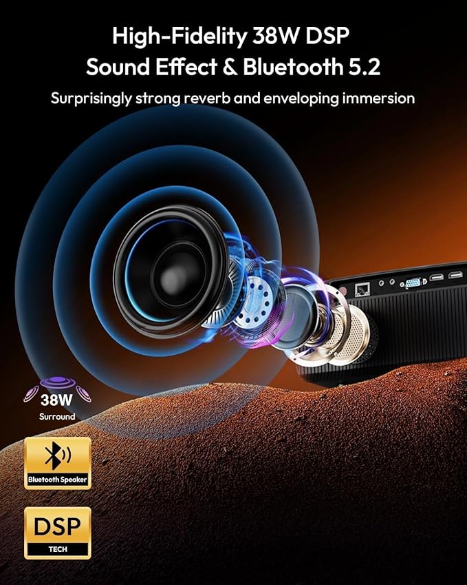 - [ Blazing Fast WiFi 6 & Bluetooth 5.2 ] Enjoy dual-band 5G/2.4G WiFi and Bluetooth 5.2 for faster connectivity, greater data transfer, and lower latency compared to other projectors. Easily mirror videos, photos, and games from your smartphone or Miracast-enabled devices