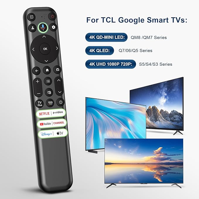 - 【Universal Compatibility】Only for TCL Google 4K UHD HDR LED QLED QD-Mini LED Full-HD Smart TVs: QM8/QM7/S5/S4/S3/Q7/Q6/Q5 Series etc..Not for TCL fire TV.Not for TCL Roku TV.No voice function