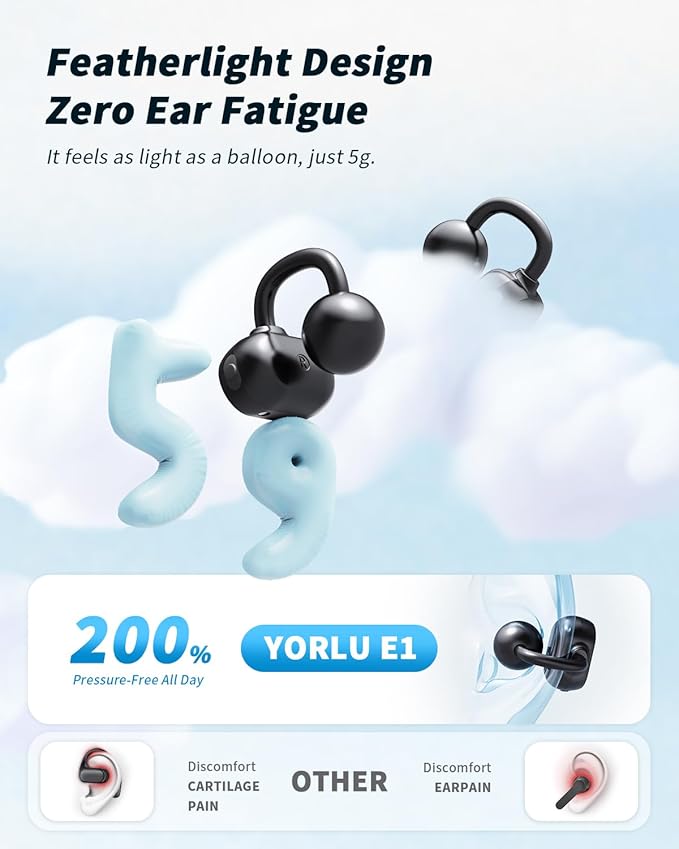 - [Genuine Bone Conduction] Yorlu E1 clip on earbuds feature an advanced 12mm bone conduction driver that delivers sound through your bones for a comfortable, open-ear experience. Equipped with YorluDirect Audio Tech and a fully sealed cavity for precise audio direction and minimal sound leakage—protecting your privacy in any environment. With special acoustic cavity and digital sound enhancement tech, the designed acoustic space offers clear and distinct HI-FI sound.