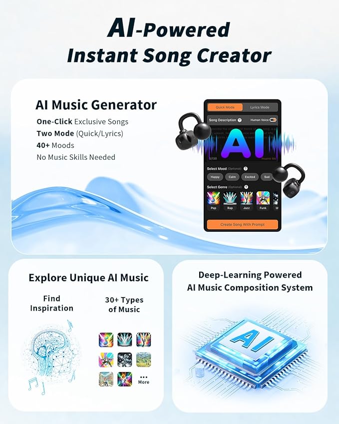 Bone Conduction Headphones, Bluetooth 5.4 Clip On Earbuds, Lightweight 5g Open Ear Headphones, AI Music Generator, IP68 Waterproof Sport Earphones for Workouts and Daily Use