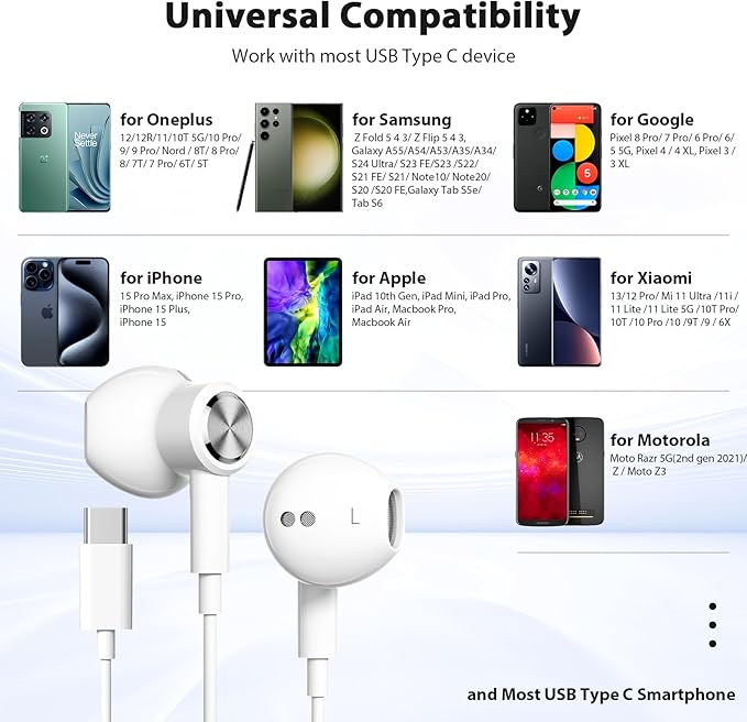 - Widely Compatibility: USB C Wired Earbuds compatible with iPhone 17 Pro Max/ 17 Air/ 17 Pro/ 17/, iPhone 16e/ 16 Pro Max/ 16 Plus/ 16 Pro/ 16/ iPhone 15 Series, Samsung A53/ A54/ A55/A35, Galaxy S24 Ultra/S24 FE/ S23/S22/S21/S20, Galaxy Z Flip 6 5 4 3 2/ Z Fold 6 5 4 3 2, Galaxy Tab S9/S9+/S9 Ultra/S8/S7/S6, Google Pixel 8 Pro/ 7 Pro/ 6 Pro/5/4/4XL/3/3 XL,for iPad 10th/Pro/Mini/Air 2024, for MacBook Pro/ Air, for OnePlus 12R/ 12/ Open/ 11/ 10 Pro/ 10t / 9 Pro/ 9/ 8T/8 Pro/7T Pro/7