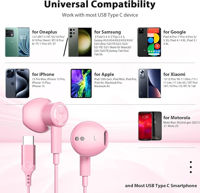 - Widely Compatibility: USB C Wired Earbuds compatible with iPhone 17 Pro Max/ 17 Air/ 17 Pro/ 17/, iPhone 16e/ 16 Pro Max/ 16 Plus/ 16 Pro/ 16/ iPhone 15 Series, Samsung A53/ A54/ A55/A35, Galaxy S24 Ultra/S24 FE/ S23/S22/S21/S20, Galaxy Z Flip 6 5 4 3 2/ Z Fold 6 5 4 3 2, Galaxy Tab S9/S9+/S9 Ultra/S8/S7/S6, Google Pixel 8 Pro/ 7 Pro/ 6 Pro/5/4/4XL/3/3 XL,for iPad 10th/Pro/Mini/Air 2024, for MacBook Pro/ Air, for OnePlus 12R/ 12/ Open/ 11/ 10 Pro/ 10t / 9 Pro/ 9/ 8T/8 Pro/7T Pro/7