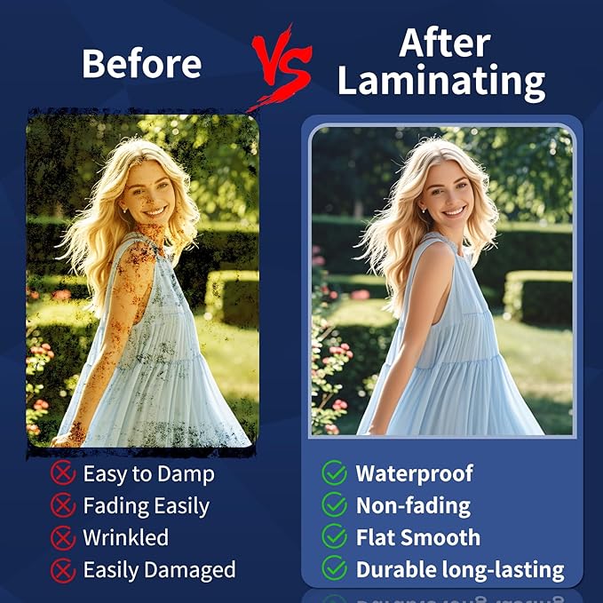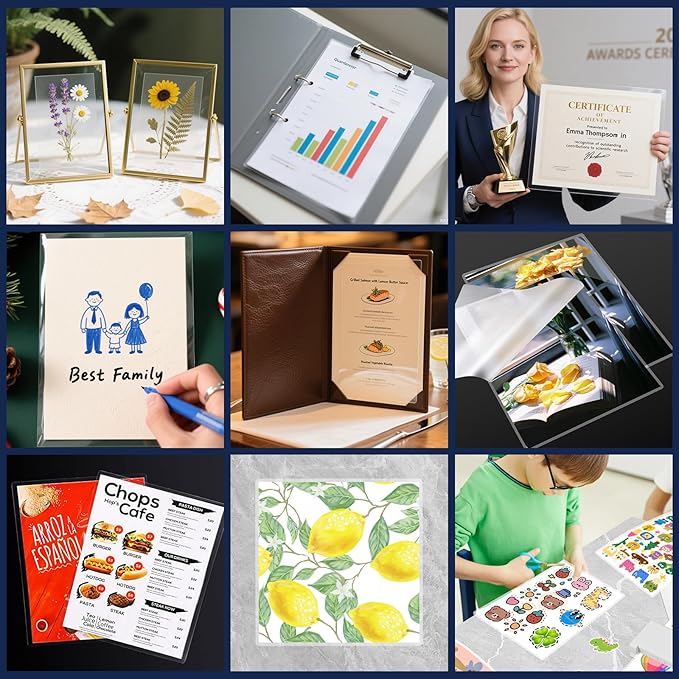 - ✅ Crystal-Clear laminating sheets - Our premium laminate sheets feature a high-transparency glossy finish that enhances color and detail—perfect for signs, menus, flashcards, and displays that need to stand out.