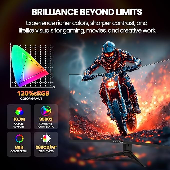 - 120% sRGB Color Accuracy: With a 120% sRGB color gamut, 288 cd/m² brightness, and a 3500:1 high contrast ratio, this curved computer monitor delivers rich, vibrant, and true-to-life colors—perfect for photo editing, content creation, video streaming, and immersive gaming. The wide color coverage ensures exceptional accuracy for creative work, while the sleek design fits seamlessly into home office, professional, or entertainment setups