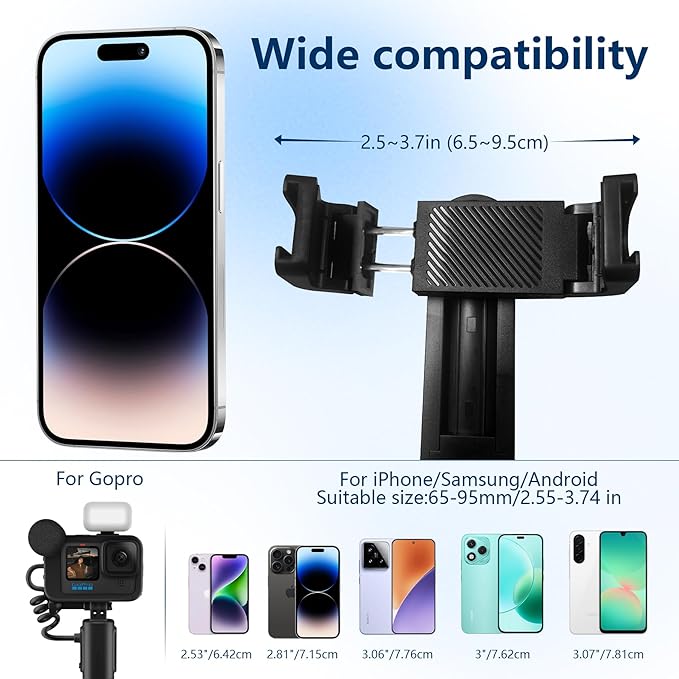 - Wide Phone Compatibility: Compatible with most smartphones, including iPhone and Android devices. Secure grip ensures your phone stays steady while shooting photos and videos.