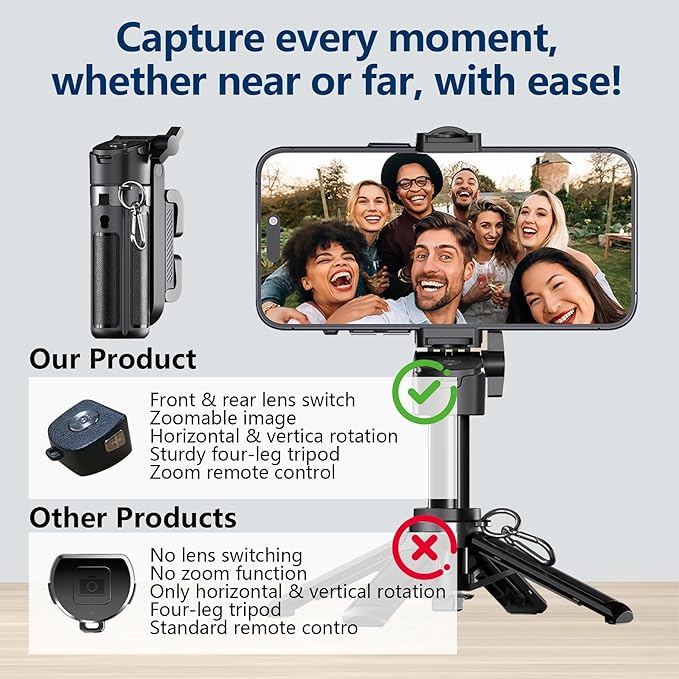 - With Zoom Function: Comes with a detachable remote that not only lets you snap photos and start/stop video recording from a distance, but also supports zoom in/out for easy framing without touching your phone.