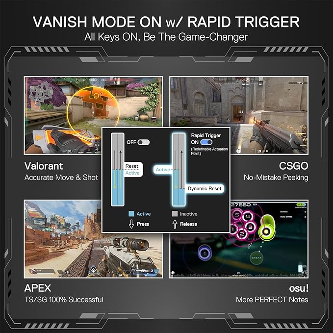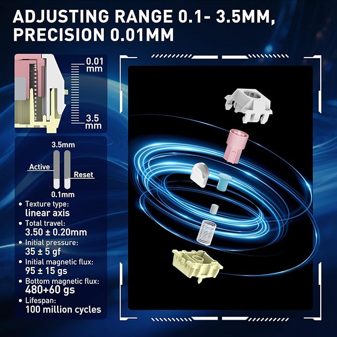- Rapid Trigger Tech - Combine the Hall magnetic switch with rapid trigger ON via software, the actuation point can be 0.1mm precision adjusted between 0.1-3.4 mm (The actual effect of the 0.1-0.2 mm actuation point may be affected by the normal tolerances of the components), ultra-precise actuation point combo with dynamic activation/deactivation defines your one-tap-kill.