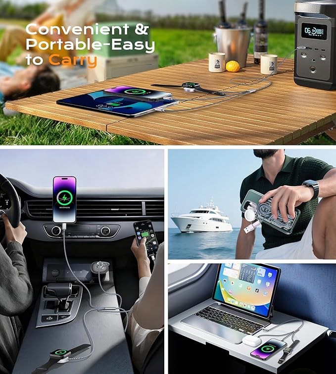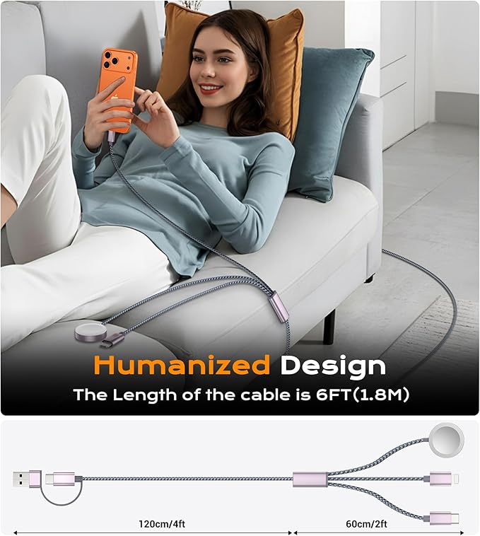 - 【3-in-2 Multi Charging Cable】3-in-2 multi charging cable provide 6 charging modes (USB-C/A for Apple Watch charger, Lightning, and Type-C),which compatible with iWatch Series 1-9, SE, and Ultra models, compatible with iPhone 17 and newer models,and iPads (Lightning/USB-C).A portable travel charger and a universal charging cable for multiple devices,designed to charge multiple devices at once