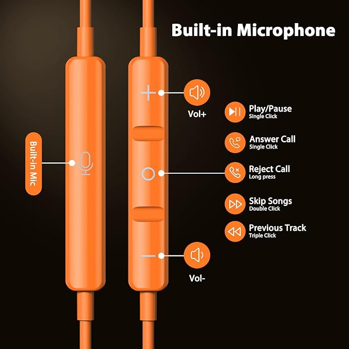 - In-Line Control Type-C Headphones: The remote control buttons of Type-c headphones allow you to play/pause songs, skip next/previous song without picking up your phone. Easy access to volume control on the go. The USB-C earphones has built-in microphone which can hand free calling, allow you to easily answer/reject calls