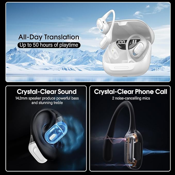 - 4-in-1 Function & HD Stereo: Our translation earbuds integrate real time translation, music playback, and phone calls into one compact device. Featuring a 14.2mm HiFi dynamic driver, they deliver immersive stereo sound with powerful bass and clear treble. Built in ENC noise cancellation filters out up to 90% of background noise, ensuring crystal clear calls even in noisy environments. Perfect for business travel, language learning, workouts, daily communication, or entertainment.