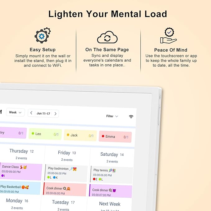 - 【All-In-One Digital Calendar】: WiFi digital calendar + planner touchscreen display + digital picture frame that will get the whole family organized and running smoothly. It’s never been easier to keep the whole family informed by assigning each member their own color and chores. (NOTE : Can Not Wall Mount)