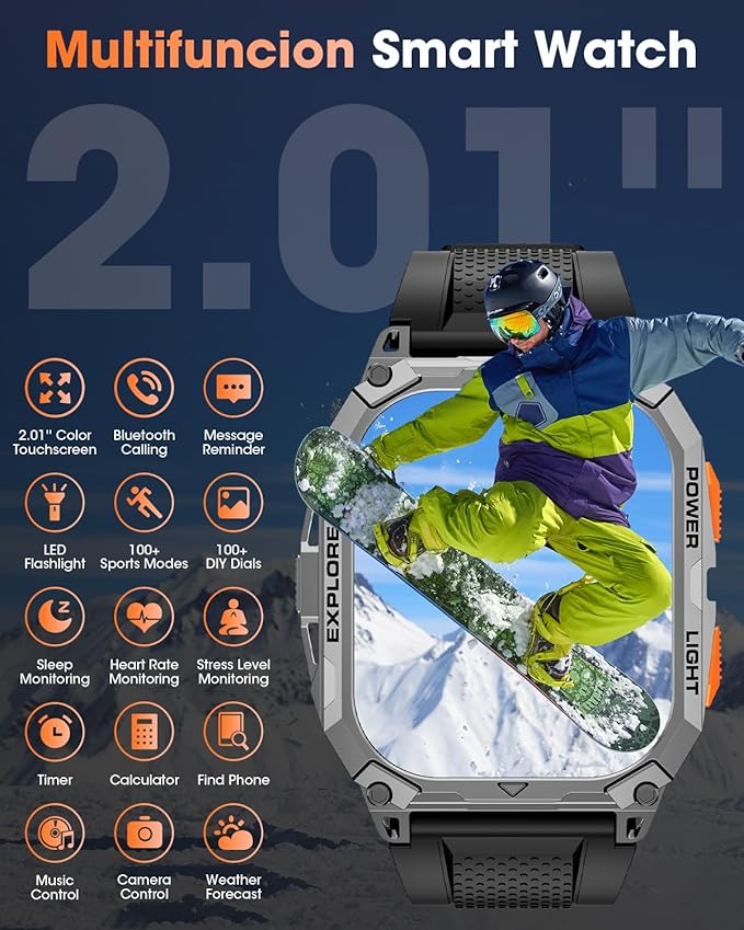 - 【2.01" HD Touchscreen】This men's smartwatch has a 2.01-inch ultra-high-definition screen with a resolution of 320×390, delivering sharper color quality and a vivid visual experience. The built-in LED flashlight illuminates up to 6-10m, providing convenient lighting for nighttime activities or outdoor adventures.