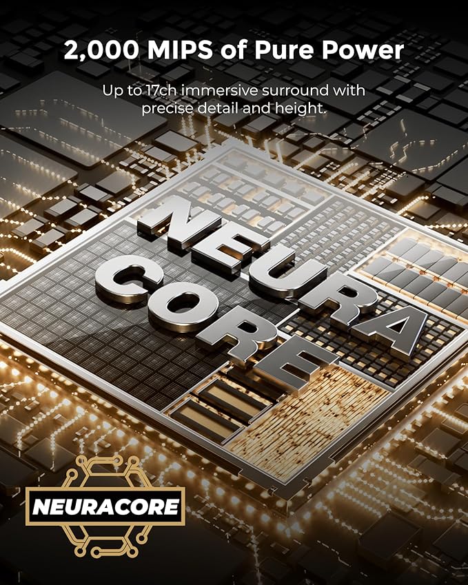 - NEURACORE Multi-Channel Audio Engine: Driven by a triple-core DSP and dual-core MCU, NEURACORE delivers ultra-precise 24-bit/192kHz audio with <0.5% distortion. With up to 2,000 MIPS processing power, it supports up to 17 channels for pinpoint surround imaging, cinematic height realism, and immersive spatial fidelity.
