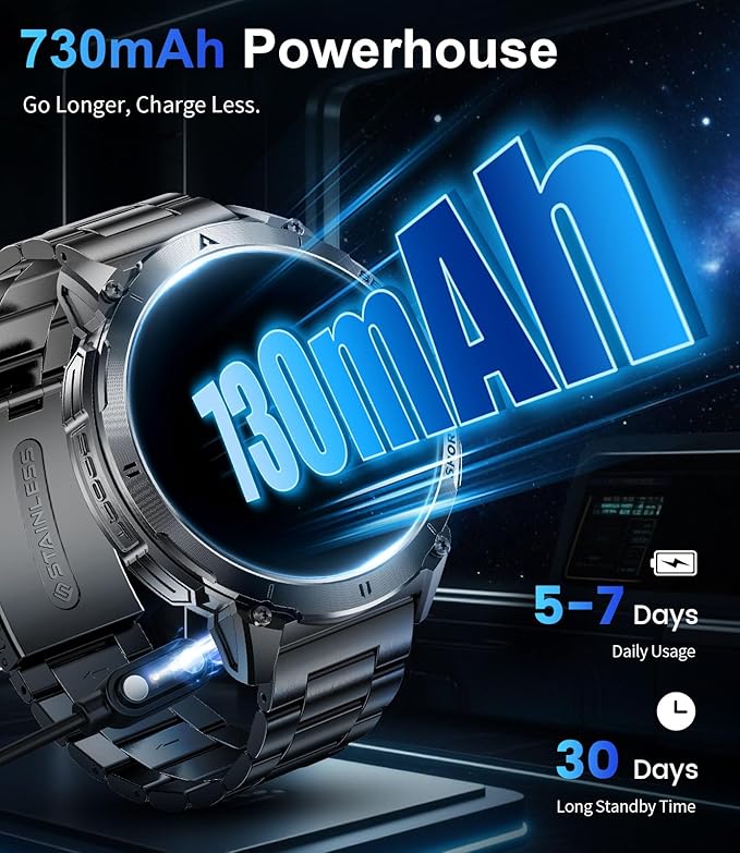 - ⚡【Long-Lasting Battery & Fast Charging】Powered by a 730mAh polymer battery, this smart watches for men keeps up with your busy life for 5-7 days on a single charge and up to 30 days in standby mode. With 3-hour magnetic fast charging, you spend less time waiting and more time staying connected.