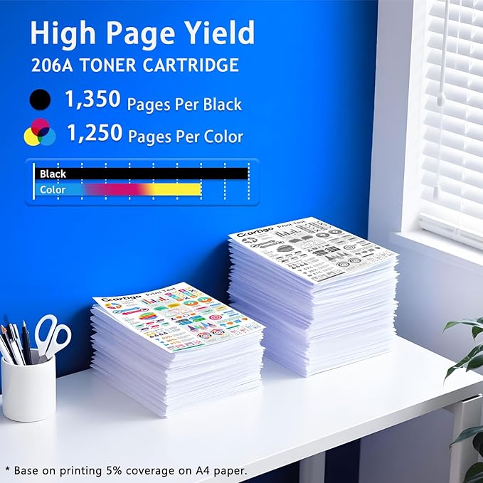 - High Page Yield : Up to 1,350 pages per 206A Black Toner Cartridge & 1,250 pages per 206A Cyan/Yellow/Magenta Toner Cartridge (at 5% Coverage, Letter/A4)