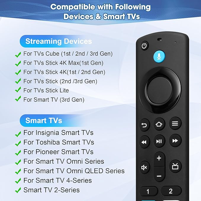 - Applicable Streaming Device Models:stick(2nd/3rd gen), tv stick lite, tv stick 4k(1st/2nd gen), tv stick 4k max(1st/2nd gen), tv cube(1st/2nd/3rd gen), smart tv(3rd gen), replacement remote control with voice search for Insignia/Toshiba/Pioneer smart tvs
