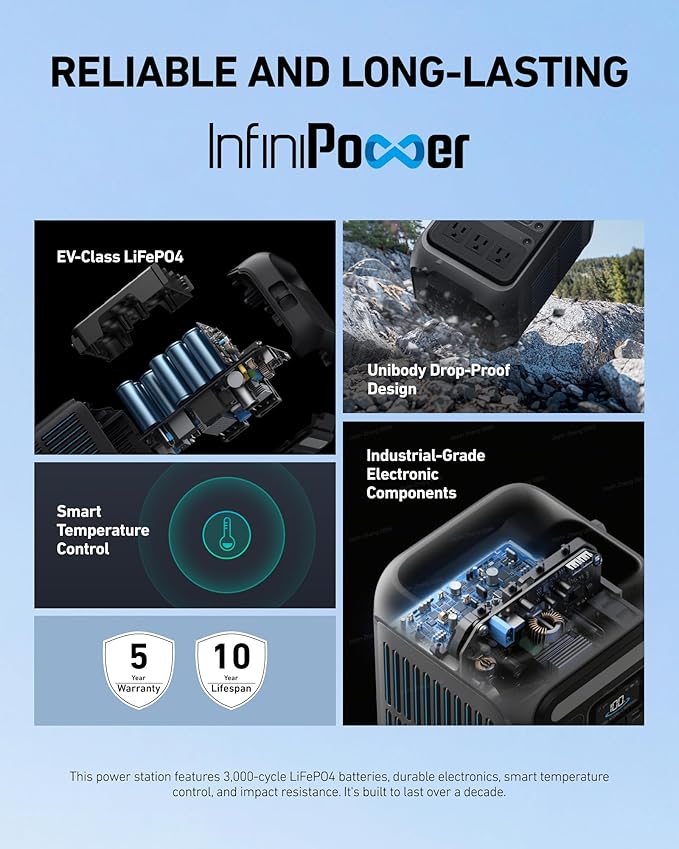- 10 Years of Power: Built to last a decade, power up with LiFePO4 batteries, designed to last 3,000 cycles. Also enjoy smart temperature control, impact resistance, and a 5-year warranty.