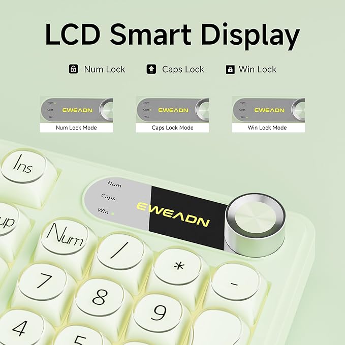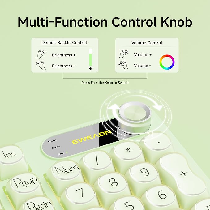 - Dedicated Knob & Display Screen: Equipped with a smart rotary knob, this wired membrane keyboard allows effortless control: toggle between backlight modes with a single press, adjust brightness by rotating the knob, or hold FN + knob to switch to multimedia mode for volume control and mute. The built-in display shows the EWEADN logo and real-time status like Caps Lock, Num Lock, and Win Lock—keeping you informed without any software
