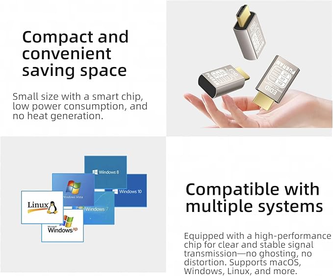- ✅Function:4K@120HZ HDMI dummy plug Can enable the PC to enable the GPU to create a virtual display to perform tasks,Simulate high resolution for remote control,Up to 4K@60HZ/120HZ, compatible with 7680 x 4320@30Hz,4096 x 2160@60/120 Hz,1440@60HZ/120/144HZ,1080P@60HZ/120/144HZ, etc.(Notice:The graphics card interface must support HDMI 2.1 version to achieve 4K/120HZ refresh rate)