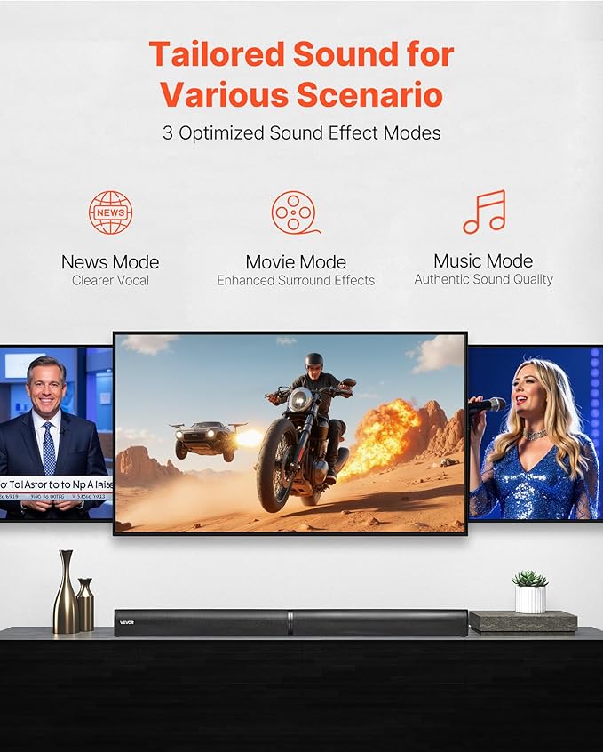 - Sound Effect Modes: This TV sound bar provides three modes. Movie mode enhances the surround sound effect, music mode reproduces authentic quality for rich musical details and melodies, and news mode clears vocals for accurately conveyed content